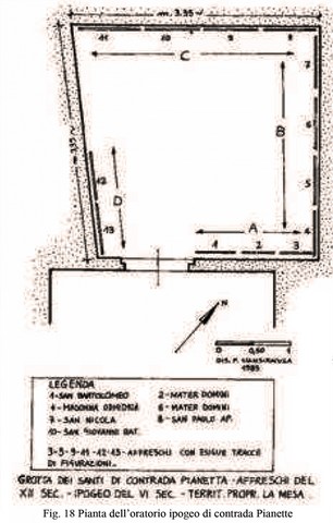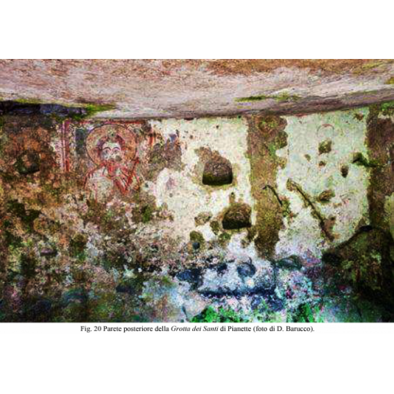 L’oratorio di Pianette è un semplice ambiente ipogeo quadrangolare (m 3 circa di lato) dal soffitto piano, nel quale si apre un lucernario di cm 50 di diametro, preceduto da un modesto vestibolo (figg. 17-18); nella parete di nord-ovest sono intagliate due piccole nicchie sovrapposte e sfalsate mentre numerose teche lunettate, impiegate per accogliere lucerne votive, sono allineate a cadenza regolare sotto i dipinti.