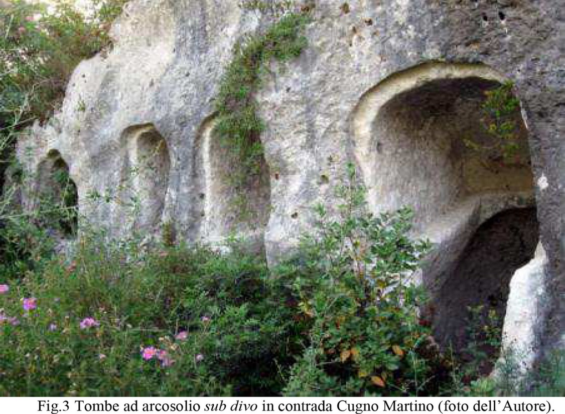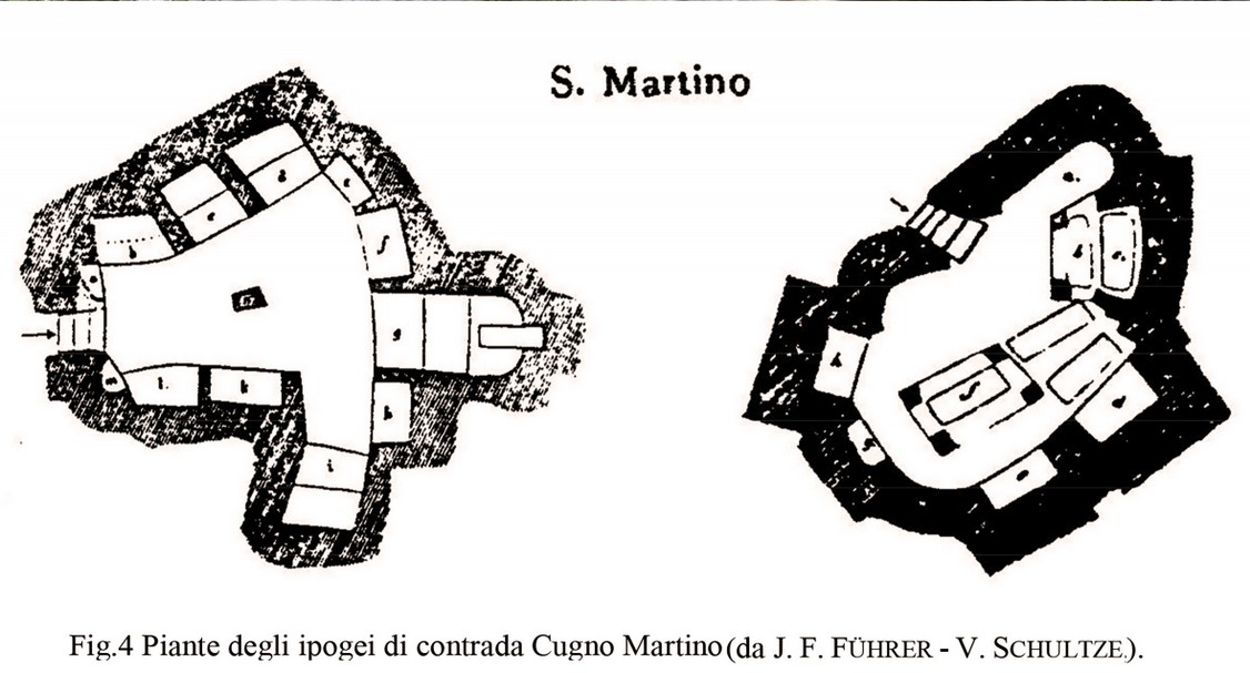 Il Cugno (o Cozzo) Martino è un piccolo acrocoro che dal casale di Alfano si protende verso sud-est in direzione di Canicattini ed è delimitato a sud dal vallone Martino e a nord dalla “trazzera” che dalla strada consorziale di S. Alfano conduce alla località Timparossa.13 Nella parte più alta, significativamente chiamata Cozzo del Morto dalla gente del luogo, Salvatore Carpinteri osserva un cimitero a cielo aperto composto da circa 200 tombe a fossa, prevalentemente campanate e disposte senza alcun ordine, molte delle quali all’epoca ancora intatte. Nel Vallone Scagato si trovano le tombe cosiddette a forno o “siculo-bizantine”, già individuate dal Führer14 (fig. 3) e di sovente sormontate da croci incise o a rilievo: il declivio sud presenta 35 sepolture, simili per accuratezza dell’esecuzione e per dimensioni e distribuite in quattro piccoli gruppi, ed una camera ipogeica contenente quattro loculi; il versante nord, invece, ha complessivamente 13 tombe, gravemente devastate e collocate in due gruppi di 3 sepolcri ciascuno, uno di 5 e in posizione isolata le rimanenti 2. Sul ripiano roccioso, infine, sono localizzati ulteriori 4 ipogei, al cui interno si trovano arcosoli monosomi o bisomi e i baldacchini (fig. 4).