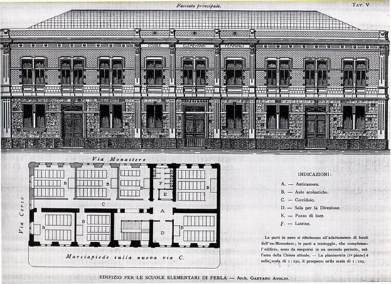 Il preventivo di spesa ammonta a L. 27.000, di cui L. 1 1.200 per la facciata principale, la scala, la ritirata e la sistemazione delle prime quattro aule e L. 15.800 pei prospetti sulle vie Corso e Monastero, le tre aule supplementari ed il corridoio centrale.