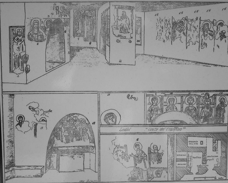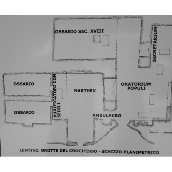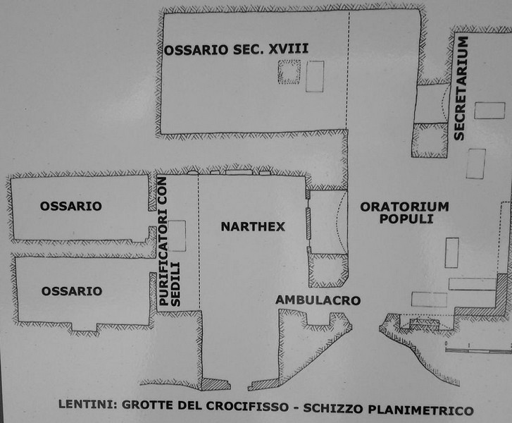 La più importante ed articolata Chiesa è quella del Crocifisso. Si tratta di un complesso rupestre formato in origine da due vani quadrati, simmetrici e affiancati. Quello di destra ha nella parete est l’altare con un’abside ogivale e, sulla parete opposta, due vani separati da una lista di roccia.