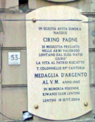 La lapide è stata posta in via Pitagora, sulla casa dove l'eroe lentinese nacque e trascorse la sua fanciullezza.