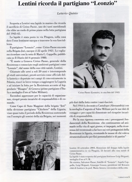 Cirino Paone "Leonzio" - eroe della Resistenza da un articolo tratto dal "Cammino" di Siracusa del 28-2-98