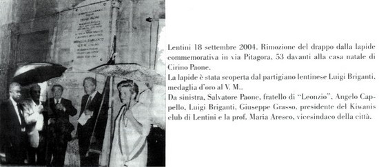 Lentini 18 settembre 2004. Rimozione del drappo dalla lapide commemorativa in via Pitagora, 53 davanti alla casa natale di Cirino Paone.