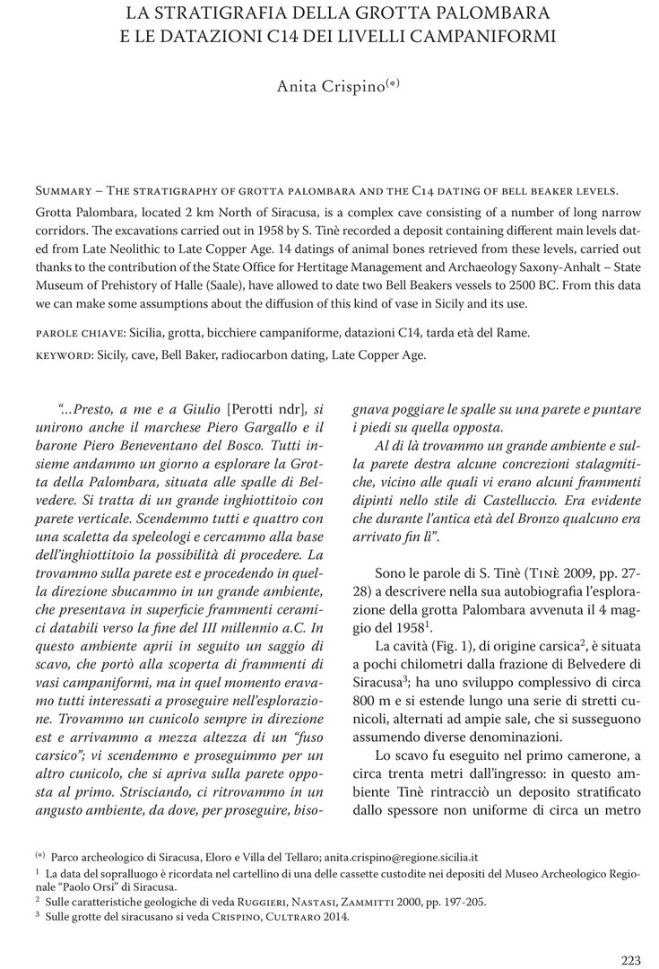 Il livello più antico di frequentazione della cavità ha restituito pochi frammenti databili al Tardo Neolitico (cultura di Diana) a cui si sovrapponevano strati ascrivibili a tutte le fasi dell'Eneolitico.