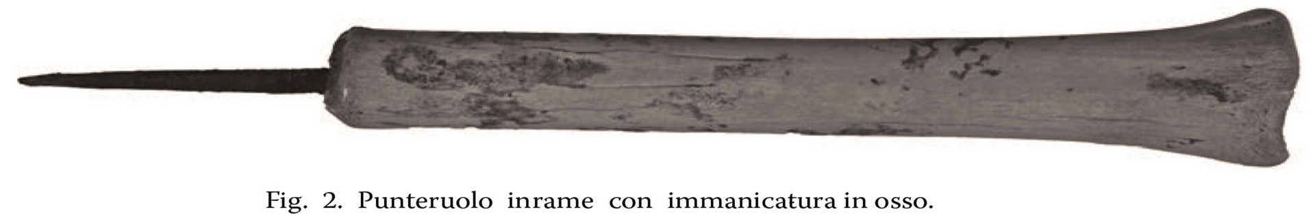 Di particolare interesse i rarissimi manufatti quali il punteruolo in rame con immanicatura in osso (Fig. 2)