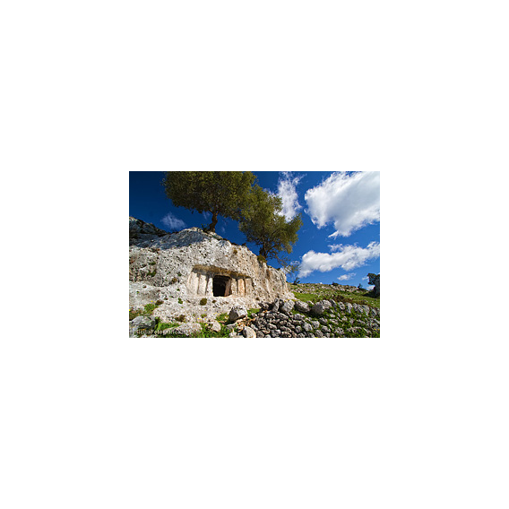 La cella funeraria, preceduta da una anticella, ha pianta circolare e una nicchia laterale destinata alle sepolture e alle offerte. Ai piedi dell’entrata un gradino interno facilita l’accesso alla camera sepolcrale e sulla sommità del tetto è stato scalpellato un foro, in parte rovinato e annerito da fuliggine, forse un riadattamento medievale per agganciarvi una lucerna o torcia. A circa 1 km di distanza più a sud, su una parete coperta da folta vegetazione nei pressi di un piccolo torrente, si trova una quarta tomba monumentale avente però prospetto ad otto pilastrini liberi, di cui solo due sono rimasti intatti ed uno verosimilmente lasciato incompiuto, realizzati risparmiando il calcare nel processo di escavazione. Accanto alla porta di accesso si trova una lastra di pietra trapezoidale, forse parte dell’originario chiusino della tomba, mentre all’interno la cella ha pianta ellittica e mostra a sinistra dell’ingresso un letto funebre risparmiato.