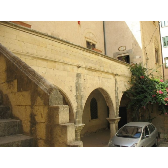 medievali di cui restano solo piccole tracce. Unico a salvarsi, anche se rimaneggiato, è il Palazzo "Greco" che attualmente è sede del Dramma Antico.Come si legge sul tabellone in primo piano, è in costruzione l'edificio del