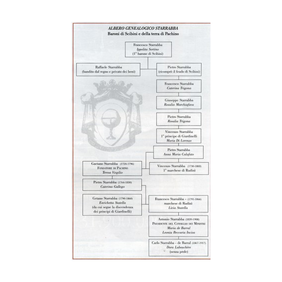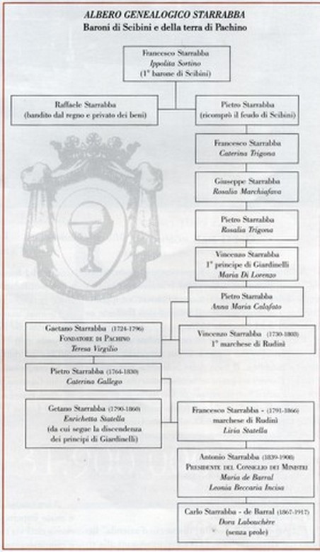 Francesco Paolo Starrabba morì nel 1866 lasciando erede "dell'intero stato di Pachino, con tutte le terre libere e canoni che ne fanno parte" il figlio Antonio.