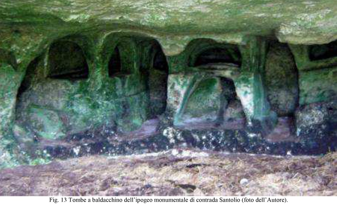 Nella necropoli di Santolio i sepolcri risultano raggruppati in tre zone, due delle quali sono situate ai lati delle case padronali dei Politi mentre la terza si trova al di là della conca principale.25 Salvatore Carpinteri documenta 19 ipogei (fig. 12), al cui interno vi sono arcosoli, loculi per bambini e baldacchini monumentali, e piccoli gruppi di tombe a forno e a fossa sub divo disposte alla rinfusa. Il più importante ipogeo della necropoli26 era originariamente dotato di tre baldacchini monumentali: parzialmente conservato è un grandioso tegurium a due sarcofagi, dalla pianta trapezoidale e privo della parte anteriore, in cui sei pilastri di forma quadrangolare sono disposti tre sul lato orientale e tre su quello occidentale per formare due finestre ad arco per parte ed una sola nei lati corti (fig. 13); degli altri baldacchini rimangono sul soffitto e sul piano di calpestio le parti terminali dei pilastri.
