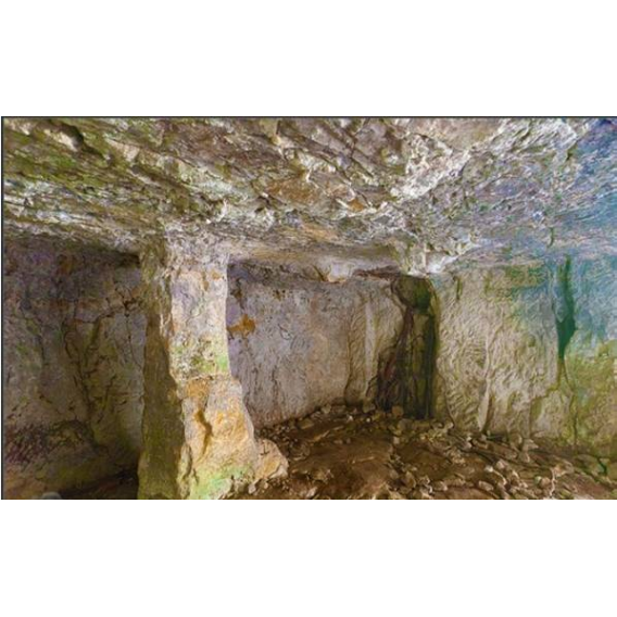 Mentre l’ingresso presenta tracce di un ampio vestibolo con nicchie, all’interno, quasi del tutto interrato, da un parte si distinguono varie lunette laterali ed incassi per lucernai, e da quella opposta si apre invece un ambiente al centro del quale si trovava una struttura circoscritta da quattro colonne (ancorché ne rimane solo una) che poteva essere una tomba a baldacchino oppure un tegurium battesimale simile a quelli rinvenuti in altre strutture rupestri dell’area.