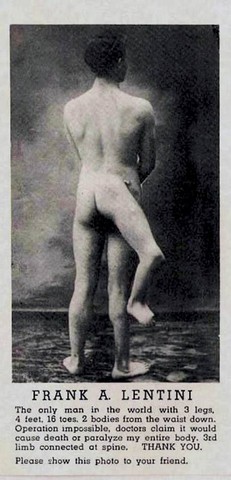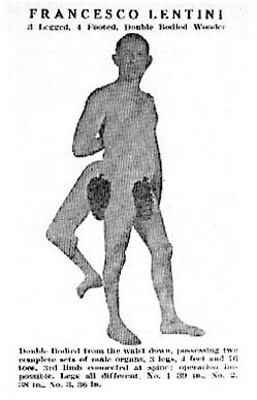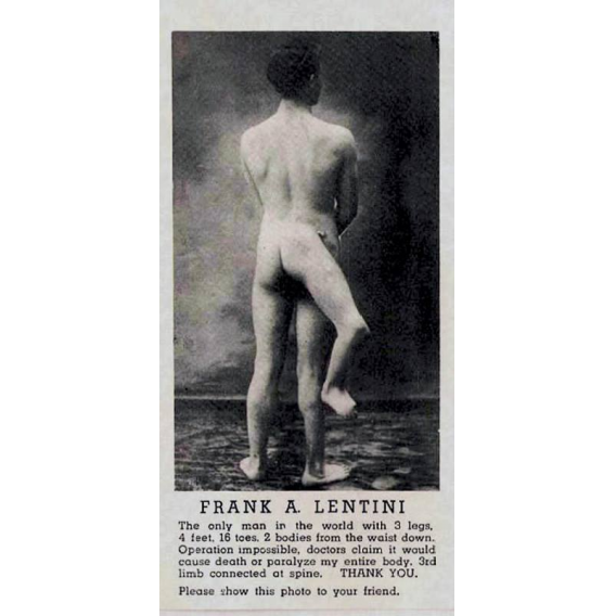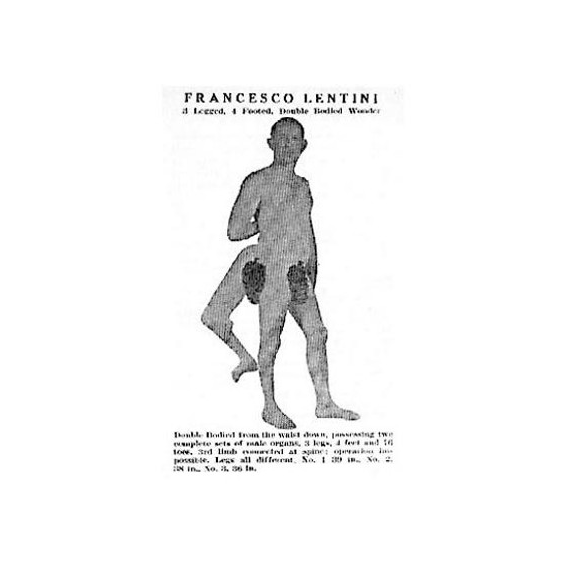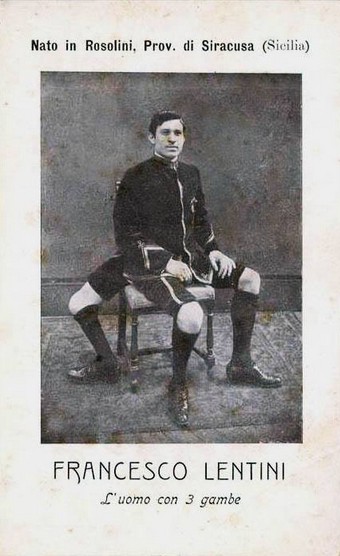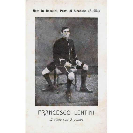 Ma c’è anche una fonte diretta. Una mini-autobiografia di poche righe, stampata in un booklet, il libricino che si comprava agli spettacoli. Qualche abile invenzione da star system (tra cui la data di nascita, che Lentini fa corrispondere a quella del suo arrivo negli Usa) e una rassicurazione al suo pubblico: «La mia terza gamba non mi infastidisce per nulla. Posso andarmene in giro tranquillamente e con la stessa naturalezza di qualsiasi persona normale: camminare, correre, saltare…».