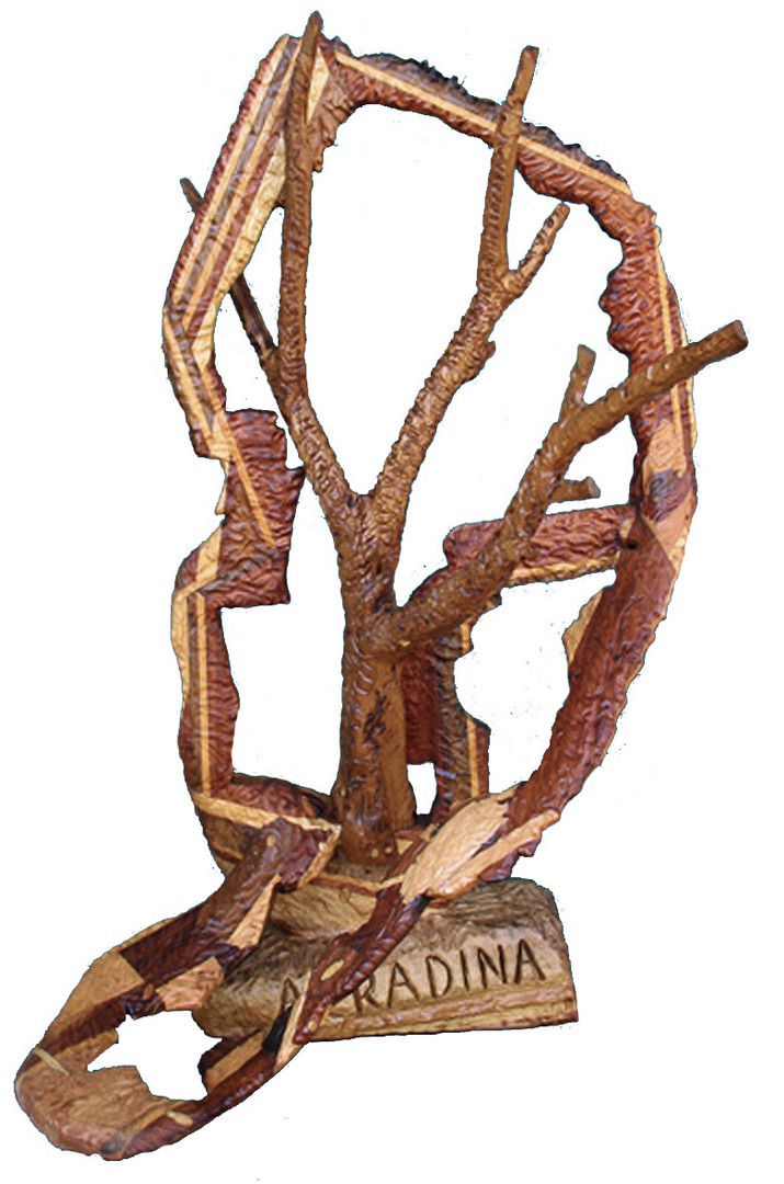 Opera n.102, anno 2002, tecnica mista, dimensioni 90x50 cm., legni, mogano, noce, faggio e ramen assemblati, ritagliati e scolpiti, verniciatura naturale.